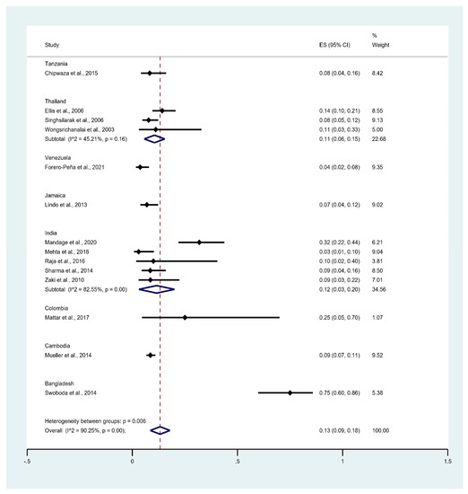 The prevalence of malaria and leptospirosis co-infection among febrile patients was estimated from 10 studies that enrolled 5838 febrile patients [29,30,31,33,34,36,37,39,40,41]. The results showed that the pooled prevalences of malaria and leptospirosis co-infection among febrile patients in studies using ELISA/MAT, ELISA alone, and MAT alone for diagnosed leptospirosis were 2% (95% CI: 0–3%, I2: 85.2%), 1% (95% CI: 0–2%, I2: 84.5%), and 6% (95% CI: 3–12%), respectively (Figure 2).