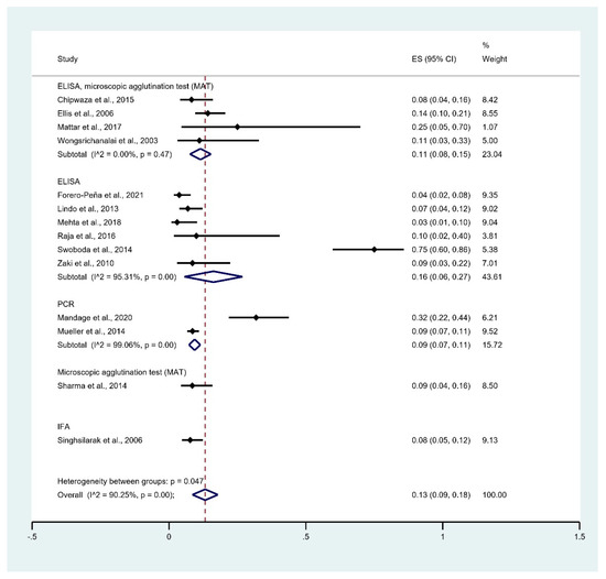 The prevalence of leptospirosis infection among malaria patients was estimated from 14 studies that enrolled 1750 malaria patients [29,30,31,32,33,34,35,36,37,38,39,40,41,42]. The results showed that the pooled prevalence of leptospirosis infection among malaria patients in studies using ELISA/MAT, ELISA alone, PCR, PCR, MAT alone, and IFA alone for diagnosing leptospirosis were 11% (95% CI: 8–15%, I2: 0%), 9% (95% CI: 7–11%, I2: 99.1%), 9% (95% CI: 4–16%), 6% (95% CI: 3–12%), and 8% (95% CI: 5–12%), respectively (Figure 4).