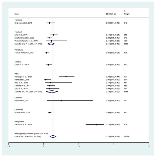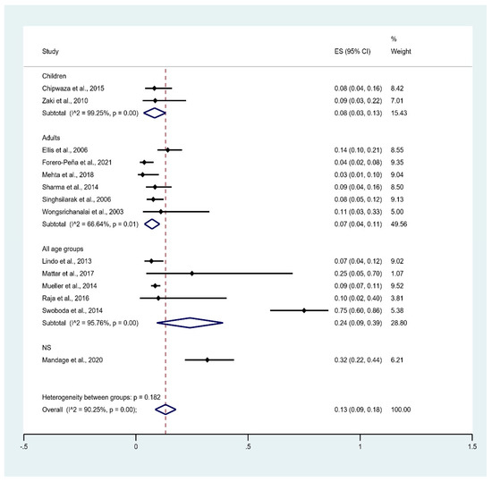 The subgroup analysis of age groups showed that the pooled prevalence of leptospirosis infection among malaria patients was 8% in children (95% CI: 3–13%, I2: 99.3%), 7% in adults (95% CI: 4–11%, I2: 66.6%), and 24% in all age groups (95% CI: 9–39%, I2: 95.8%). Overall, the pooled prevalence of leptospirosis infection (186 cases) among malaria patients was 13% (95% CI: 9–18%, I2: 90.3%) (Figure 6).