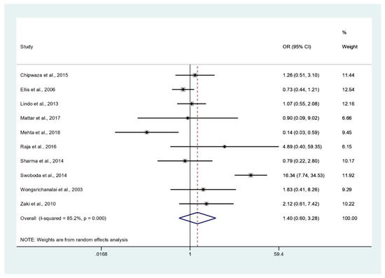 The odds of malaria and leptospirosis co-infections (86 cases) among febrile patients (5838 cases) were estimated using the data of 10 studies [29,30,31,33,34,36,37,39,40,41]. The results of the individual study showed the lower odds of co-infection in one study conducted in India (OR: 0.14, 95% CI: 0.03–0.59) [34], while the higher odds of co-infection was demonstrated in one study conducted in Bangladesh (OR: 16.34, 95% CI: 7.74–34.5) [39]. Overall, the meta-analysis showed that malaria and leptospirosis co-infections occurred by chance (p: 0.434, OR: 1.4, 95% CI: 0.6–3.28, I2: 85.2%) (Figure 7).