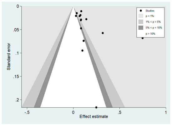 The result of Egger’s test showed a non-significant small study effect (p: 0.07, coefficient: 2.75, standard error: 1.38, t; 1.99). The contour-enhanced funnel plot showed missing studies in non-significant areas (p > 0.01) indicating that the cause of funnel plot asymmetry may more likely be due to publication bias (Figure 9).