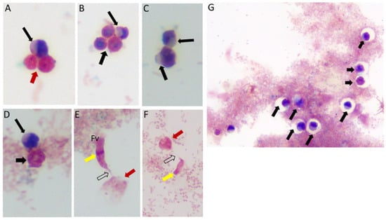 Sam-Yellowe’s trichrome staining protocols were used to stain formalin-fixed cells of Colpodella sp. (ATCC 50594) from di-protist cultures. Two major life cycle stages occur in Colpodella sp. (ATCC 50594) and the staining protocol distinguishes these. The stages are trophozoites and cysts of predator and prey. Figure 1 shows cysts and trophozoites of Colpodella sp. (ATCC 50594), and Colpodella sp. (ATCC 50594) trophozoites attached to P. caudatus prey. Black arrows show young demilune cysts of Colpodella sp. (ATCC 50594) (panels A–D, G). Colpodella sp. (ATCC 50594) cysts have a large clear zone surrounding the cyst, separating the cysts from bacteria. Mature cysts of Colpodella sp. (ATCC 50594) are identified by black arrowheads (panels B, D and G) and P. caudatus cysts are identified by the red arrowhead (panel A). Predator (yellow arrow)-prey (red arrow) in myzocytosis with tubular tethers of varying lengths (open black arrows), used for attachment, are shown in panels E and F. A large posterior food vacuole (Fv) is formed in the predator as cytoplasmic contents are aspirated from the prey. Multiple predators can attach to one prey at a time for feeding in the process of myzocytosis. Figure 2 shows as many as seven predators attached to one prey (Figure 2A, blue arrows, red arrowhead indicates prey) and six predators attached to one prey in Figure 2B (blue arrows, red arrow indicates prey). Egressed trophozoites from Colpodella sp. (ATCC 50594) cysts were identified, still attached at the anterior ends (Figure 2C,D).
