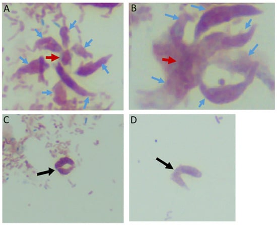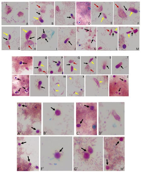 - Sam-Yellowe, T.Y.; Getty, T.A.; Addepalli, K.; Walsh, A.M.; Williams-Medina, A.R.; Fujioka, H.; Peterson, J.W. Novel life cycle stages of Colpodella sp. (Apicomplexa) identified using Sam-Yellowe’s trichrome stains and confocal and electron microscopy. Int. Microbiol. 2021. [Google Scholar] [CrossRef] [PubMed]