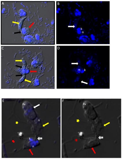(A–D): Differential Interference contrast (DIC) microscopy of DAPI stained Colpodella sp. (ATCC 50594) life cycle stage transitions. (A,C) Merger of DIC and DAPI stained Colpodella sp. (ATCC 50594) trophozoites (yellow arrow) and P. caudatus prey (red arrow) in myzocytosis. Two predators feeding on one prey are shown in panel (C). The tubular tether joining predator and prey is indicated by the black arrow. (B,D) DAPI stained nuclei and kinetoplast. The kinetoplast (k) and nucleus (n) of P. caudatus is identified in panels (B,D). The central nucleus of Colpodella sp. (ATCC 50594) trophozoites is indicated by the white arrows. (E,F): Differential Interference contrast (DIC) microscopy of DAPI stained Colpodella sp. (ATCC 50594) life cycle stage transitions. (E) Merger of DIC and DAPI. (F) DIC alone. Colpodella sp. (ATCC 50594) trophozoite (yellow arrow) shown in myzocytosis with P. caudatis (red arrow). The tubular tether between predator and prey is indicated by the open arrow. DAPI stained aspirated contents can be seen at the posterior food vacuole of the Colpodella sp. (ATCC 50594). Yellow arrowhead identifies the flagella of Colpodella sp. (ATCC 50594) and the flagella of the prey are indicated by the red arrowhead. The kinetoplast (k) and nucleus of the prey and the nucleus of Colpodella sp. (ATCC 50594) were identified.
