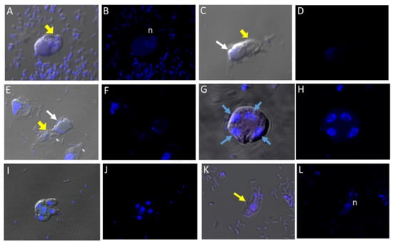 (A–L): Differential Interference contrast (DIC) microscopy of DAPI stained Colpodella sp. (ATCC 50594) life cycle stage transitions. DIC and DAPI staining of pre-cyst and cyst stages of Colpodella sp. (ATCC 50594). Yellow arrowhead shows frayed anterior end of encysting trophozoites in panels (A,C,E). White arrows identify the DAPI stained aspirated contents from the prey in the posterior food vacuole. A four-nuclei cyst is identified in panels (G,H), a five-nuclei cyst in panels (I,J) and a young trophozoite in panels (K,L). The central nucleus (n) was identified.