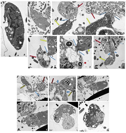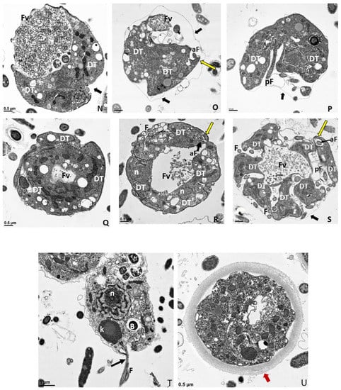 Following myzocytosis, the anterior end of the Colpodella sp. (ATCC 50594) trophozoite disintegrates resulting in loss of the flagella and organelles to form the pre-cyst formed from the posterior food vacuole (Fv), remnant cytoplasm and nucleus (Figure 6J and enlarged in Figure 6K). The young cyst stages of Colpodella sp. (ATCC 50594) with developing trophozoites (DT) are shown in Figure 6L,M with the residual food vacuole (Fv) and a thin cyst wall (black arrow). Cysts containing two developing trophozoites (Figure 6N–P), three (Figure 6Q), four (Figure 6R) and seven (Figure 6S) developing trophozoites are shown. Colpodella sp. (ATCC 50594) cysts can have both asymmetric and symmetric division as both odd and even-numbered juvenile trophozoites were observed within mature cysts. In Figure 6O,P,R,S, juvenile trophozoites at different stages of maturity were observed. Asynchronous development was observed where one trophozoite already had a developed pseudo-conoid. The developed pseudo-conoid in the cysts indicated by yellow arrows was identified along with flagella (anterior and posterior).