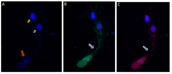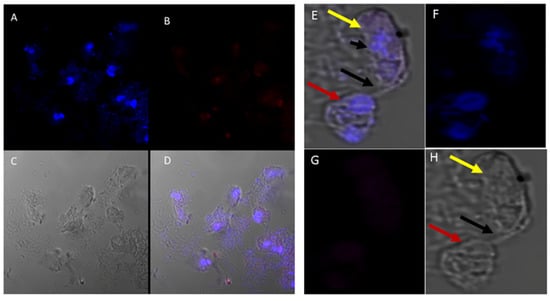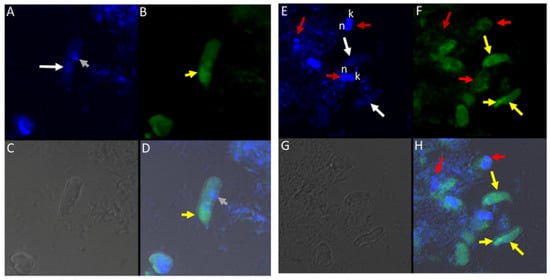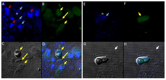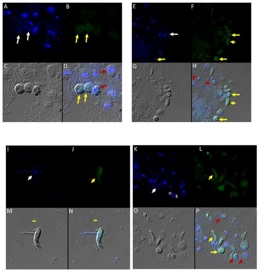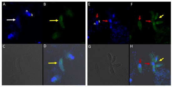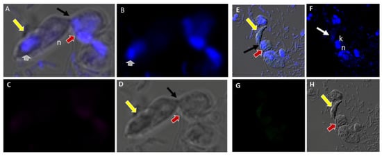 There was no reactivity observed with normal mouse (Figure 13C,G) and rabbit serum (Figure 13E–H) used as negative controls. Aspiration of DAPI stained contents (grey arrowhead, Figure 13A,B) from the prey was detected in the posterior food vacuole of a Colpodella sp. (ATCC 50594) trophozoite (yellow arrow) attached to P. caudatus prey (red arrow) (Figure 13A,E). The nucleus (n) and kinetoplast (k) of P. caudatus and the central nucleus of Colpodella sp. (ATCC 50594) trophozoite (white arrow) were identified by DAPI staining.