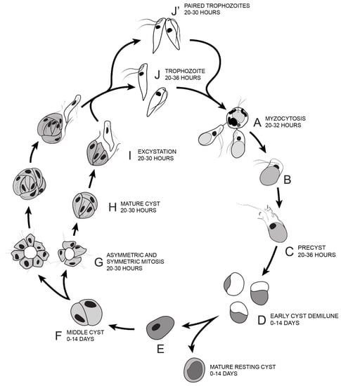 Based on the life cycle stages identified by Sam-Yellowe’s trichrome staining, DIC microscopy, DAPI staining, ultrastructure investigated by TEM and time course experiments, the transitions through the life cycle of Colpodella sp. (ATCC 50594) are summarized as shown from steps A–J’ in Figure 14. Colpodella sp. (ATCC 50594) trophozoites attach to P. caudatus prey (A) and feed by myzocytosis, after which trophozoites begin to undergo encystation by first forming the pre-cyst (B, C) which differentiates into the early demilune cyst (D). The most active stage of the life cycle in culture is between 20–30 h after subculture with peak activity at 20–28 h. Colpodella sp. (ATCC 50594) encyst in culture to form transient and long-term cysts. Transient cysts excyst and release trophozoites in the active phase of the culture. Long term (mature resting) cysts can survive in culture for up to 14 days (E). The demilune cysts (D) mature and divide to form two trophozoites (F) then divide to form more than two trophozoites (G, H). Multinucleate cysts can contain up to ten nuclei. Cysts with four and seven nuclei are depicted (G, H). Trophozoites egress as individual trophozoites (I, J) or egress as a pair still attached at the anterior end with incomplete cytokinesis (J’). The duration of the life cycle in culture is 36 h.