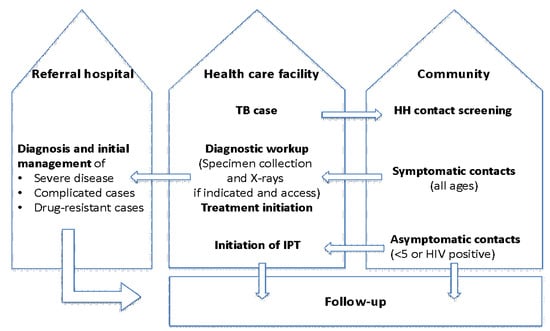 - Schwoebel, V.; Koura, K.G.; Adjobimey, M.; Gnanou, S.; Wandji, A.G.; Gody, J.C.; Delacourt, C.; Detjen, A.; Graham, S.M.; Masserey, E.; et al. Tuberculosis contact investigation and short-course preventive therapy among young children in four African countries. Int. J. Tuberc. Lung Dis. 2020, 24, 452–460. [Google Scholar] [CrossRef] [PubMed]