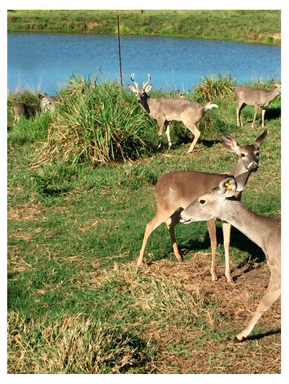 The Santo Domingo Ranch, located in Catazajá, Chiapas, México, is a working ranch dedicated to the production bovine cattle and white-tailed deer (Figure 1). The deer diet consists of the commercial feed Trophy Maker (17% protein, macro and trace minerals and Vitamins), the Microfos VE-12 nutriment (macro and trace minerals, and A, D, E vitamins (MNA, Mexico), as well as ad libitum access to water and Sporobolus airoides for grazing.