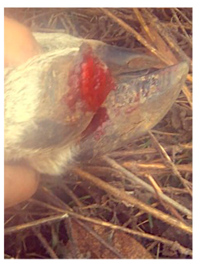 In the month of October of 2020, seven deer died; this is considered a very short span of time for the deaths to be fortuitous. Furthermore, the deer that died presented similar symptomatology, which included hair loss, a tendency to limp, sudden prostration, and inability to escape from human proximity. The manifested symptoms were noticed for the first time two days before the first death. Some of the deer also presented pododermatitis (Figure 2). The pododermatitis lesions were treated with metamizole and trimethoprim-sulfamethoxazole, as well as local lavages with soap, water, and 5% copper sulfate (Supplementary Material Video S1). Before they died, the deer presented crystalline mucous running off from the nose, and lack of strength in the neck. The metamizole and trimethoprim–sulfamethoxazole treatment was administered again, and the animals that presented the symptoms were isolated in a room. Despite all measures, the deer that presented symptoms died.