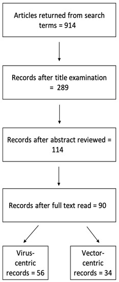 Inclusion criteria for the OROV studies were defined as the following: molecular and/or serologic detection, and epidemiological data. Exclusion criteria were defined as the following: reviews, studies without primary data (modeling, assay design, phylogenetics, immunology, physiology, insecticide investigations), duplicate study populations, Oropouche location (not virus), thesis/dissertation, book/book chapter, inaccessible/untranslatable, vector competence studies. The number of records was recorded, and they were included or excluded based on the satisfaction of the defined criteria. Titles were identified and, if obvious, used to exclude studies; abstracts were then read of the remaining studies to determine if exclusion criteria were met; finally, whole papers were read to determine if the studies satisfied inclusion or exclusion criteria.