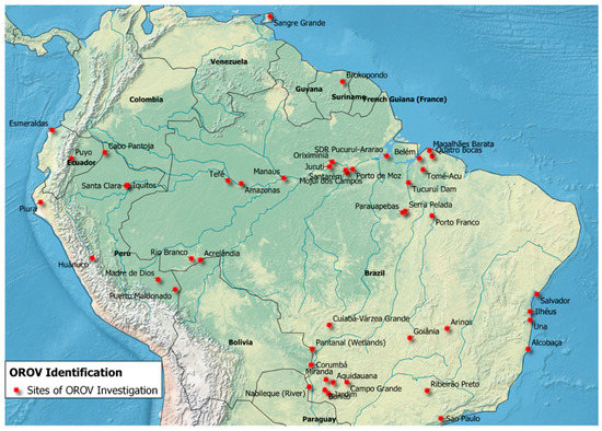 Before the emergence of Zika and chikungunya in the western hemisphere, OROV was recognized as being the second most common arboviral cause of human febrile illness in Brazil, second to dengue virus [33]. Though this virus is recognized as the etiologic agent of human disease and is known to infect animals, there is a scarcity in screening and detection outside of known areas associated with detected outbreaks [34,35,36]. Nevertheless, there is increased call for expanded screening of OROV across South America due to the significant number of cases and symptom similarity to other arboviruses to accurately attribute disease with specific pathogens [15,35]. However, efficient surveillance of under-detected pathogens requires sufficient data to target efforts either in specific locations or at specific times. The objective of this systematic review (SR) is to characterize the locations where OROV surveillance efforts have either confirmed OROV presence or not, as well as those locations where surveillance studies have detected the OROV vector independent of virus detection.