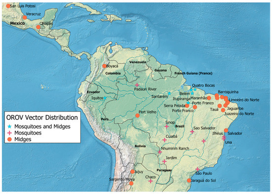 Locations where OROV vectors have been observed in Mexico and South America according to records included in this review. Map generated in ArcGIS.