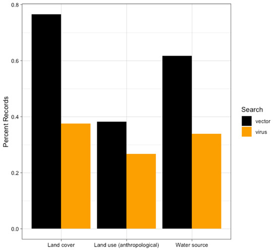 The proportion of records that had observations about land cover, anthropogenic land use, and/or water sources contained within the text according to which search they were returned from. Black represents the proportion of records in the vector data (N = 34) and gold represents the proportion of records in the virus data (N = 56).