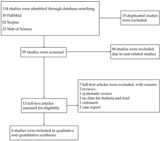 The searches in the three databases identified 114 potentially relevant studies. After 15 duplicates were removed, the titles and abstracts of 99 studies were examined; then, 86 studies were excluded as non-related studies. The remaining 13 studies were assessed for full texts; then, seven studies were excluded with reasons: three reviews, one systematic review, one study without data on malaria and lead, one comment, and one case report. Finally, six eligible studies [11,18,19,20,21,24] were included in the qualitative and quantitative syntheses (Figure 1).