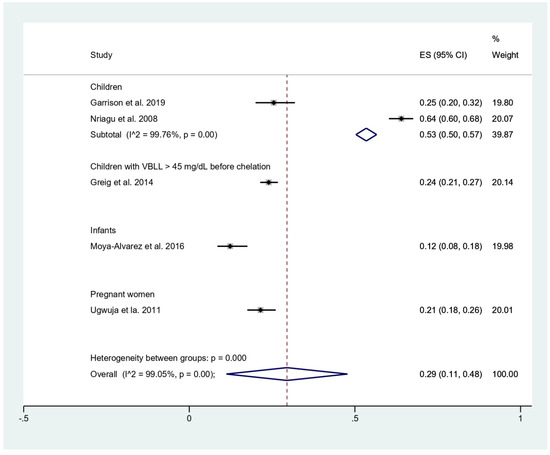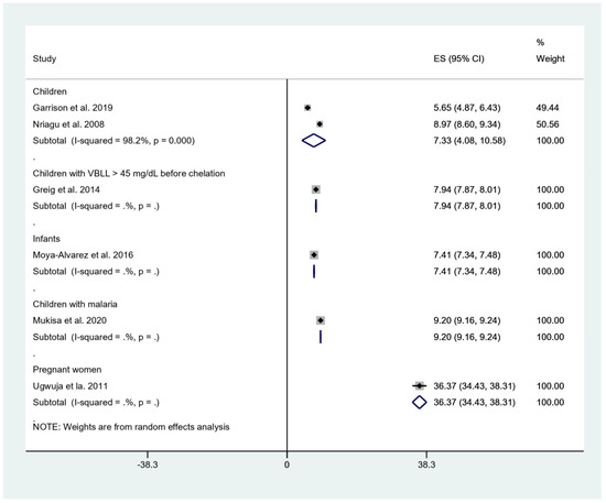 The systematic review and meta-analysis showed that the pooled mean BLL among children who were investigated for malaria was approximately 7.33 μg/dL with a high heterogeneity among the two studies (I2, 98.2%) [19,24]. The source of heterogeneity might be the difference in study site, as one was conducted in Benin [24] and the other study was conducted in Nigeria [19], or the difference in the study design, as one was a cohort study [24], while another was a cross-sectional study [19]. Among infants, a higher mean BLL of 7.41 μg/dL was observed [18], and sources of lead contamination might have been paint, piped water, leaded gasoline, or consumption of animals killed by ammunition. Moreover, high BLL in infants might be caused by iron deficiency, which leads to increased lead absorption [24]. Furthermore, in children with specific conditions, such as BLL > 45 mg/dL before chelation or positive malaria test, a higher mean of BLL was observed at 7.94 and 9.20 μg/dL, respectively. Interestingly, the highest mean BLL of 36.37 μg/dL was demonstrated in pregnant women who received antenatal care at the hospitals [11]. The high mean BLL in pregnant women might be caused by the high sensitivity of pregnant women to lead exposure due to biological changes [25].