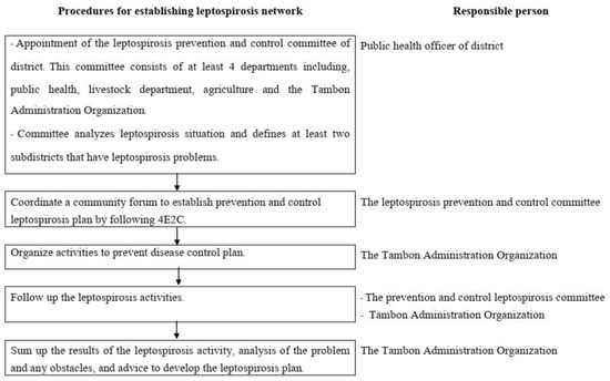 Leptospirosis prevention and control of Mahasarakham Province was implemented following the District Strengthening Disease Control which was the standard in preventing disease in the district. The District Strengthening Disease Control has been used from 2011 to now (2019). Leptospirosis prevention and control consist of two strategies via establishing the leptospirosis network participation and Surveillance and Rapid Response. Leptospirosis network participation is activated for leptospirosis prevention while Surveillance and Rapid Response team intervene when a leptospirosis case has been reported. The establishment of a leptospirosis network participation consists of five procedures shown in Figure 2.
