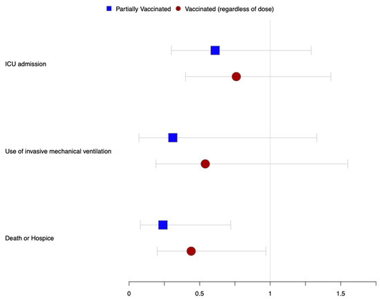 On our multivariate logistic regression analyses, the previous receipt of vaccination, regardless of the dose or days since vaccination, was associated with decreased mortality (aOR 0.44, 95% CI: 0.20–0.98). Even a single dose of mRNA vaccine was also associated with decreased mortality (aOR 0.24, 95% CI: 0.08–0.72) when compared to unvaccinated individuals. Finally, although patients with prior vaccination had lower odds of mechanical ventilation and ICU admission, those associations did not reach statistical significance (Figure 1 and Table 3).