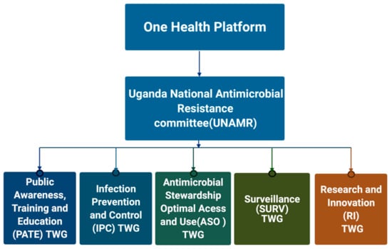 Figure 1. The design of Uganda’s AMR governance structure at national level. On top is the One health platform, under which is the committee that oversees activities on AMR in Uganda. The oversee the pillars on which the National action plan is implemented todate.