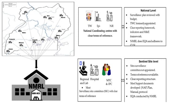 Figure 2. Uganda’s design of AMR Sentinel Surveillance system based on the already-existing Ministry of Health structure of regional referral hospitals and how functional linkages for conducting AMR surveillance from the facility level are extended to the national level.