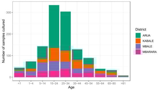 The results show between 2019 and 2020, 1209 samples were received from four of the 12 sentinel sites across the country for culture and identification of organisms, as shown in Figure 3, Figure 5, Figure 6 and Figure 8. The distribution of the cultured samples is presented in Figure 3; these show a normal distribution by age with modal age at 15−24, suggesting that the majority of samples were collected from patients within this age group. Most of these samples originated from the Arua district, whereas the Kabale district accounted for the smallest number. This preliminary output should be viewed as an early indication that the surveillance structure are functional. The extent to which all structures function will be assessed as more data is collected and as more sentinel sites are added. Nonetheless, the preliminary data reveals differences in culture and sensitivity done versus the samples collected, i.e. Kabale district.