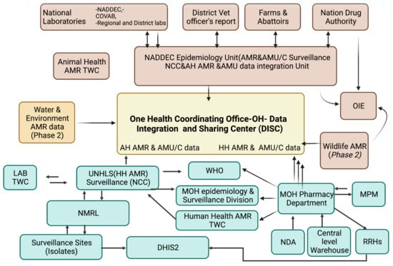 The National AMR Coordination Centre hosts the database, and according to the established data-sharing guidelines, the sharing of these data will follow the Data Sharing and Information Centre (DISC) yet to be established under the One Health for AMR. Currently, the architectural design of the data-sharing centre exists. { TC “Figure 4: Components of the AMR surveillance system” \f C \l “1” }