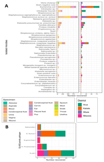 Figure 5. Microbes recovered from the cultured samples in Figure 3. Here, (A) has two panels, the first showing distribution by specimen and the second by district of origin. (B) shows the GLASS priority pathogens recovered from each of the district sentinel sites.
