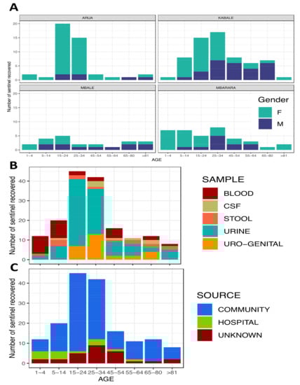 Figure 6. Preliminary analysis of microbes recovered from specific samples. (A) shows the distribution of these organisms by district, age group and gender. (B,C) show the same distribution by specimen collected and source, i.e., community or hospital.