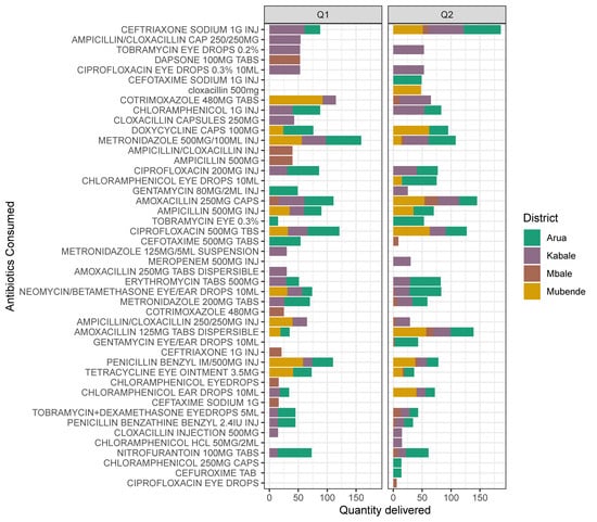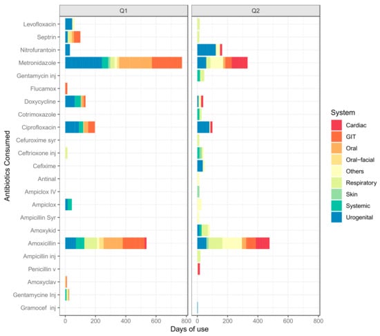 Figure 10. Antibiotic prescription at the outpatient department of Arua regional referral hospital for Quarter 1& Quarter 2 of 2019. The figure is a bar plot whose axes were flipped to improve visualisation. The y-axis shows the cumulative number of days the patients at this department were on any given antibiotics while the x-axis shows the type of antibiotics. The color fill shows the system to which the disease under management clusters. For example, a Urinary tract infections would cluster under Urogenital system. Note that majority of the “others” are malaria cases.