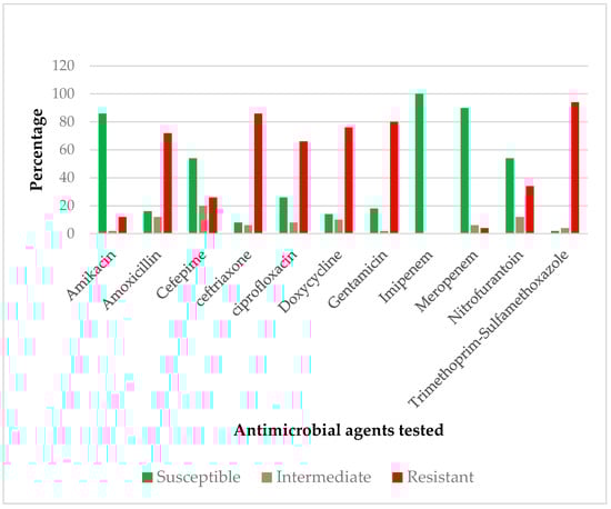 The standard Kirby–Bauer disk diffusion method was used to determine the antimicrobial susceptibility of the isolates on a Mueller–Hinton agar media (Merck, Darmstadt, Germany). A panel of 11 different commercially acquired antibiotic disks (Mast, Bootle, Merseyside, UK) was used, including Amikacin (30 μg), Amoxicillin (10 μg), Cefepime (30 μg), Ceftriaxone (30 μg), Ciprofloxacin (5 μg), Doxycycline (30 μg), Gentamicin (10 μg), Trimethoprim-Sulfamethoxazole (2/25 μg), Meropenem (10 μg), Imipenem (10 μg) and Nitrofurantoin (300 μg). For each antibiotic disk, the diameter of the inhibition zone was measured and interpreted according to the Clinical and Laboratory Standards Institute (CLSI, 2020) guidelines [16].