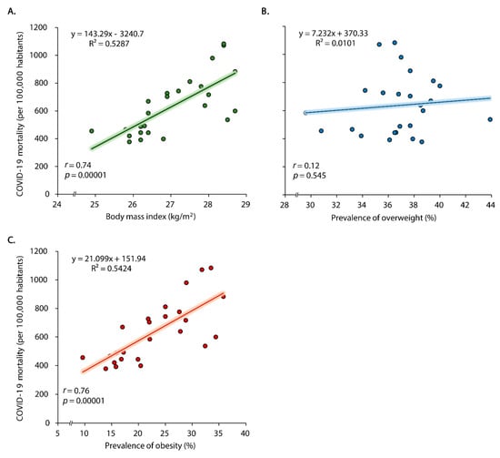 Correlation between body mass index (BMI) average (A), prevalence of overweight (B) and obesity (C) and mortality rates due to COVID-19 in Peru, March 2020 to June 2021.