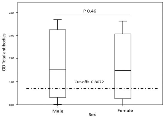 Relationship between sex versus serological data for SARS-CoV-2. A box made up of the 25th, 50th percentiles (median) is observed; 75th and extreme values represent outliers. There is no difference in seropositivity or OD of total antibodies against SARS-CoV-2 between men and women. More than 50% of the data is well above the cut-off.