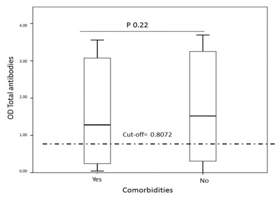 Relationship between having some comorbidity versus the serological data for SARS-CoV-2. No statistically significant differences were observed when comparing the total antibody kinetics between individuals with comorbidity versus those who did not.