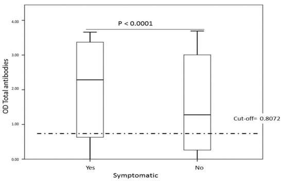 Relationship between the presence of clinical manifestations and a positive serological test for SARS-CoV-2. Higher seropositivity and OD of total antibodies are observed in individuals with clinical manifestations related to SARS-CoV-2 infection.