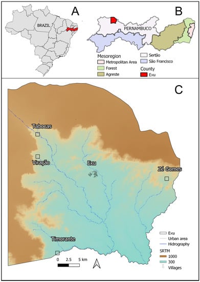 Identification of the study area: Exu, Pernambuco-Brazil. (A) Map of Brazil showing the state of Pernambuco highlighted in red. (B) Map of Pernambuco showing the mesoregions and the municipality of Exu highlighted in red. (C) Map of the municipality of Exu with hydrography and altitude (m), the urban area of Exu city (in the center) surrounded by other smaller rural settings the villages: Tabocas, Viração, Timorante and Zé Gomes. The shapefile of Exu was obtained from IBGE, the DEM from SRTM available online: http://www.dsr.inpe.br/topodata/ (accessed on 1 April 2021) and the hydrography from CPRM. These images are used for illustrative purposes only.