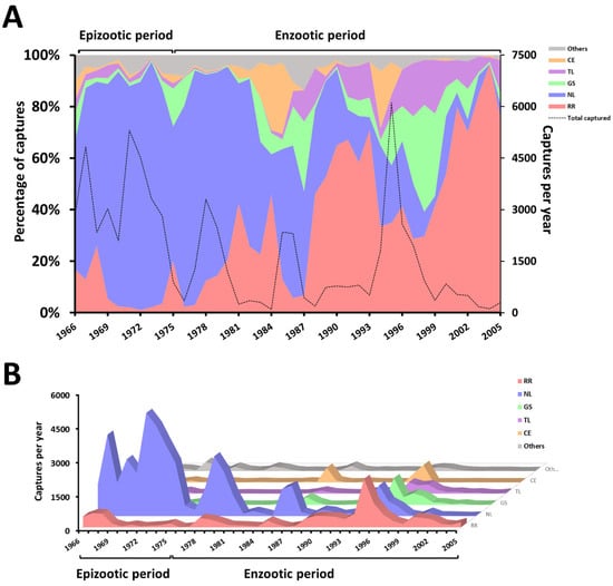 Practically since the arrival of the plague in Brazil in 1899, during the third pandemic, a surveillance and control program adjusted to the epidemiological situation, ecological and demographic characteristics and scientific and technological conditions has been carried out [7,10,17]. For several decades, the rodents were trapped for the detection of the plague bacillus and/or anti-plague antibodies [22,23,29]. The surveys among the rodents were discontinued in 2007 due to new evidence that the serological survey of plague antibodies among roaming dogs is a more efficient and cost-effective tool for plague surveillance [17,20]. By compiling the data from 40 years (1966 to 2005) of monitoring in the plague focus region of Chapada do Araripe, we were able to observe an important fluctuation in the number of captured rodents (Figure 2A,B). It is important to highlight that while the period that saw the predominance of N. lasiurus comprises the years in which human cases of plague were noted in the region (1966–1976), the period that saw the predominance of R. rattus overlapped with the enzootic period of plague [17].