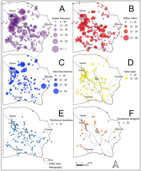 Distribution and abundance maps of the rodent species captured in the localities of Exu, Pernambuco, Brazil, 1996 to 2005. (A) Total rodents captured. (B) R. rattus. (C) N. lasiurus. (D) Galea spixii. (E) T. laurentius. (F) C. langguthi.