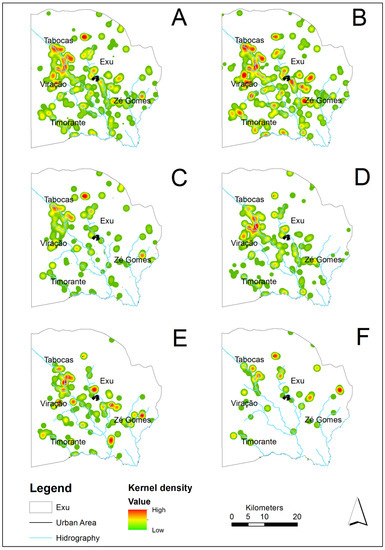 The spatial analyses performed were: (1) a map of the spatial distribution and abundance of the rodents to spatially visualize the localities and the number of animals collected in each locality (sitio, farm, village) of the municipality of Exu (choropleth maps); (2) Kernel density estimation (KDE) to identify the localization of clusters of animal occurrences. For the KDE, the following parameters were used: the bilinear interpolation method; the data classification method ‘Natural breaks (Jenks)’, with nine classes; grid cell size (bandwidth method), defined using an adaptive radius—as it is more applicable to the use of data from animals with different dispersion radii—with the area unit defined in m2. The choroplethic maps of the localization and density of the rodents collected were produced by the software Qgis Desktop 3.16.5 [27]. The Kernel maps built with ArcGIS 10 [28].