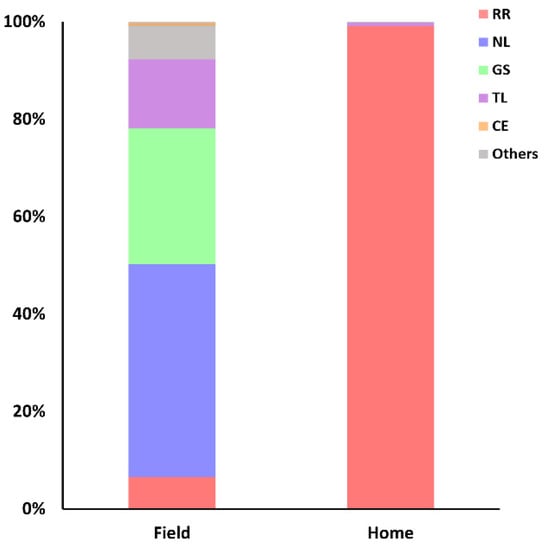 Importantly, marked differences were observed in captures from traps set at household or field environments. The proportion of traps set in fields or household environments was standardized in 3:1, respectively. While the proportions of N. lasiurus and R. rattus in field captures were 44% and 6.5%, respectively, 99% of household captures were R. rattus and no N. lasiurus were found in this environment (Figure 5).