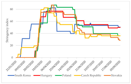 South Korea and V4 countries stringency index values between 1 January 2020 and 6 September 2020 [4].