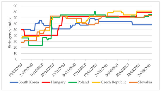 Between 22 October 2020 and 31 March 2021, the V4 countries applied significantly stricter restrictions than in South Korea (Figure 2). When the V4 countries reintroduced strict restrictions between 22 October and 1 November 2020 (stringency index values were above 50), the daily new confirmed case per one million people were 77–520 times higher in these countries than in South Korea [4]. While the stringency index values of the V4 countries were mainly in the range of 70–80 between October 2020 and March 2021, in South Korea, except for a total of 20 days, the index value remained below 65.