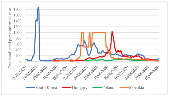 Number of tests per confirmed COVID-19 case in South Korea, Hungary, Slovakia, and Poland between January and 6 September 2020 [4].