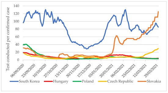 Number of tests per confirmed COVID-19 case in South Korea and V4 countries from 6 September 2020 to 31 March 2021 [4].