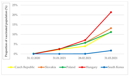 Safe and effective vaccines are essential tools for the management of the COVID-19 pandemic. Thanks to the joint procurement of vaccines in the European Union, the V4 countries were able to launch their vaccination programs from January 2021, as a result of which 11–21% of their population received at least one dose of vaccination, equating to 6–12 times the South Korean level of cover (Figure 5). The difference in the Hungarian vaccination rate compared to the other V4 countries arose because, in addition to the joint procurement in the EU, the country also uses vaccines from the Russian Sputnik and Chinese Sinopharm vaccine manufacturers in its vaccination program. South Korea began its vaccination program nearly two months later, in late February 2021, and by the end of March, the proportion of the population vaccinated with at least one dose had increased but at a slower rate.