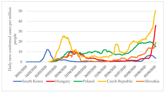 Seven-day moving average of new cases per one million population per day in South Korea and V4 countries between January 2020 and 6 September 2020 [4].