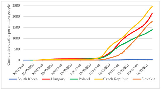 Cumulative numbers of confirmed COVID-19 deaths per one million population in South Korea and V4 countries as of 31 March 2021 [4].
