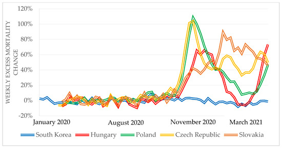 Weekly excess mortality in South Korea and V4 countries during the COVID-19 pandemic compared to the average of the previous five years, January 2020 to 28 March 2021 [4].
