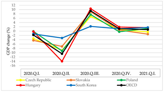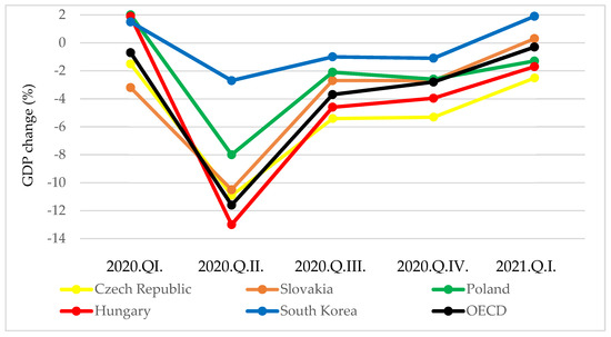 Quarter-on-quarter change in GDP (%) in South Korea and V4 countries [23].