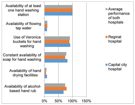 All units/wards/departments of the two hospitals had at least one hand-washing station, but only 10% and 9% of the units/wards/departments in the regional and capital cities hospitals had running tap water. Veronica buckets were the resources for hand hygiene in 89% and 92% of the units/wards/departments in the regional and capital city hospitals, respectively. A constant supply of soap was available for hand washing in the 82% of the units in the capital city hospital and 74% of units in the regional hospital. Alcohol-based hand rub was more available in the regional hospital (79%) than the hospital in the capital city (68%). In these two hospitals, less than 10% of the units, wards or departments were equipped with hand-drying facilities. In both hospitals, 90% of all the units/departments/wards were without functional sinks, and the job aids or posters for hand hygiene were not available in 47% of the regional hospital and 41% of the capital city hospital as shown in Figure 1.